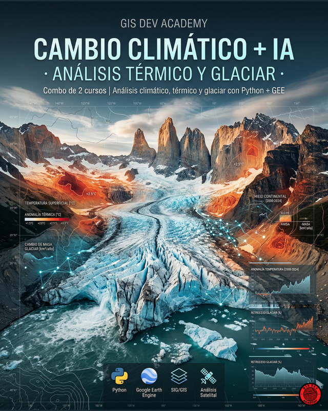 Curso práctico para analizar temperatura y cambio glaciar con datos satelitales. Aprendé a generar mapas térmicos, anomalías, detectar retroceso glaciar y presentar resultados en informes profesionales y WebGIS usando GEE, Python y SIG.