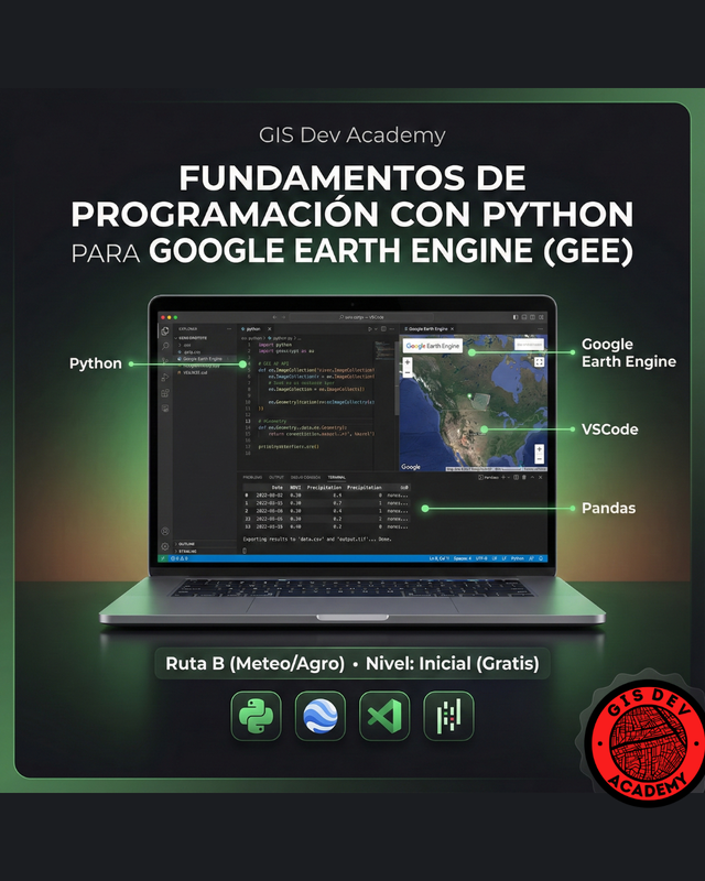 El curso gratuito "Fundamentos de Programación con Python para Google Earth Engine (GEE)" es tu puerta de entrada al mundo de la programación geoespacial. Diseñado para aquellos que desean aprender desde cero, este curso te guiará a través de la instalación y configuración de Visual Studio Code (VSCode), enseñándote los conceptos básicos de Python aplicados al análisis geoespacial.