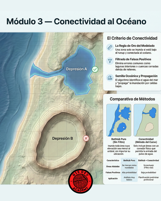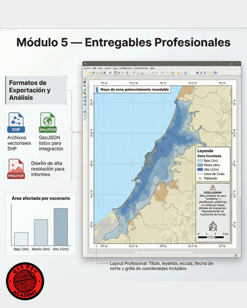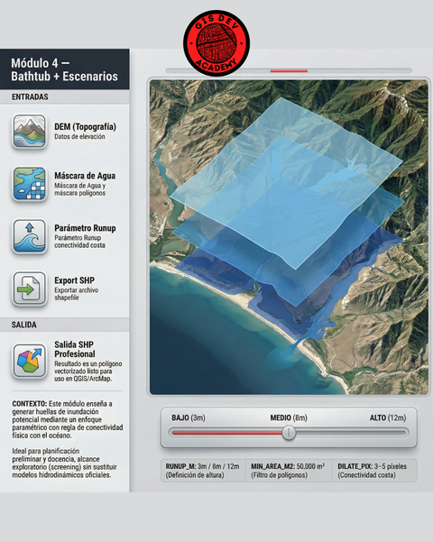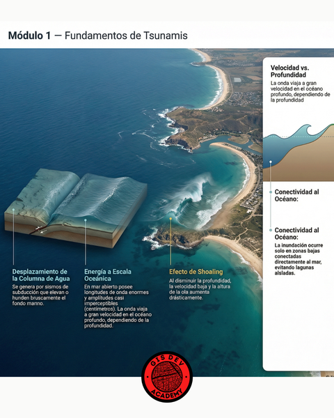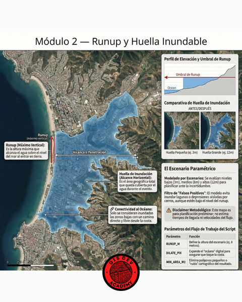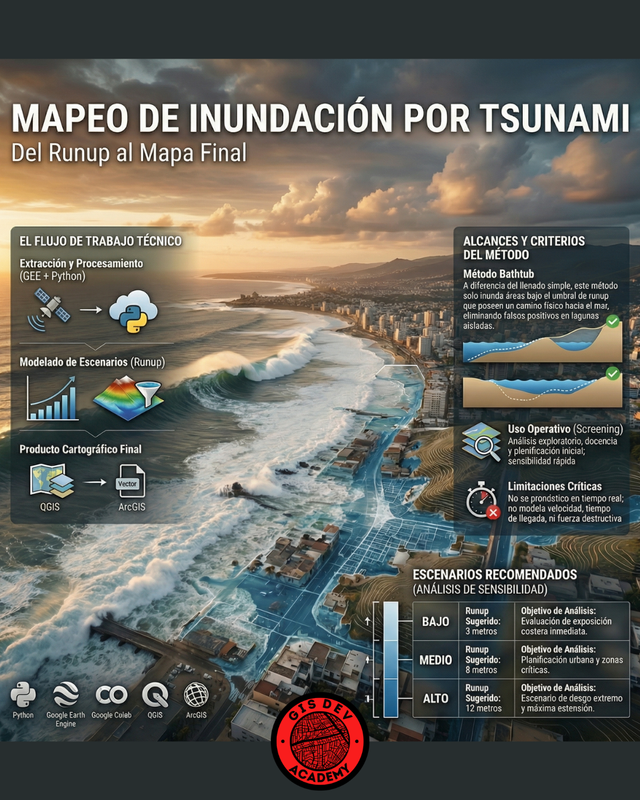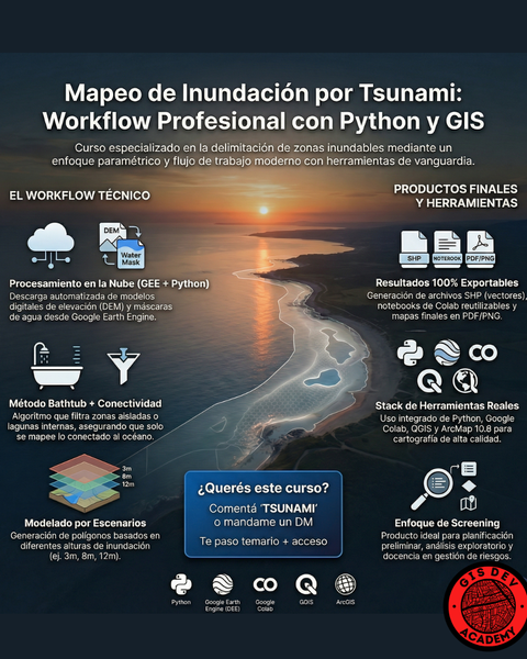 Aprendé a modelar y cartografiar una huella potencial de inundación por tsunami usando Python, Google Earth Engine y ArcMap/QGIS. Ejecutarás un flujo completo reproducible: descarga de DEM, semilla oceánica, conectividad hidráulica, generación de SHP y mapa final listo para impresión.