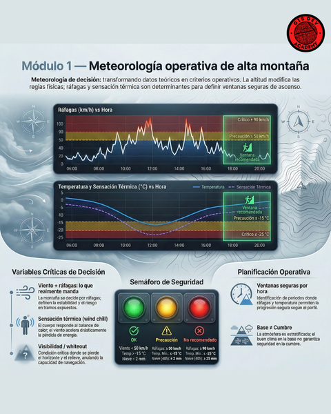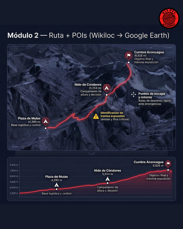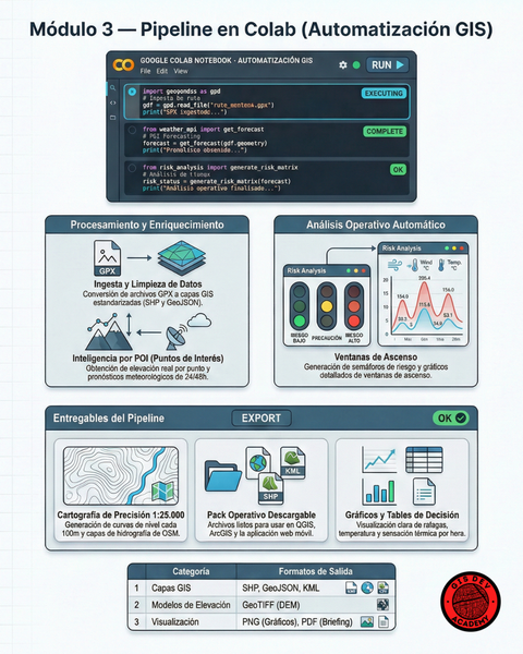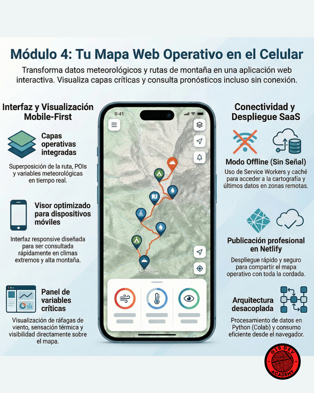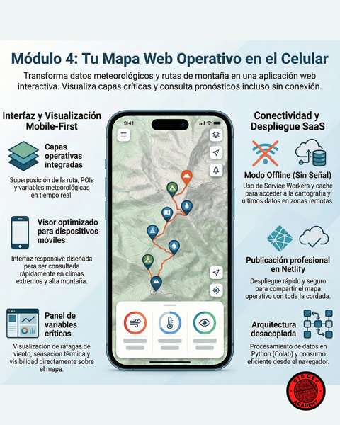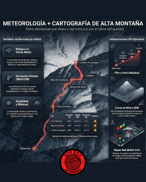 Aprendé a integrar meteorología, cartografía y desarrollo web para alta montaña. Creá rutas con POIs, analizá clima por altura, automatizá pronósticos 24/48h con Python y publicá un mapa web + informe PDF profesional en 1 click.
