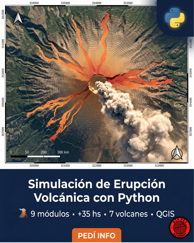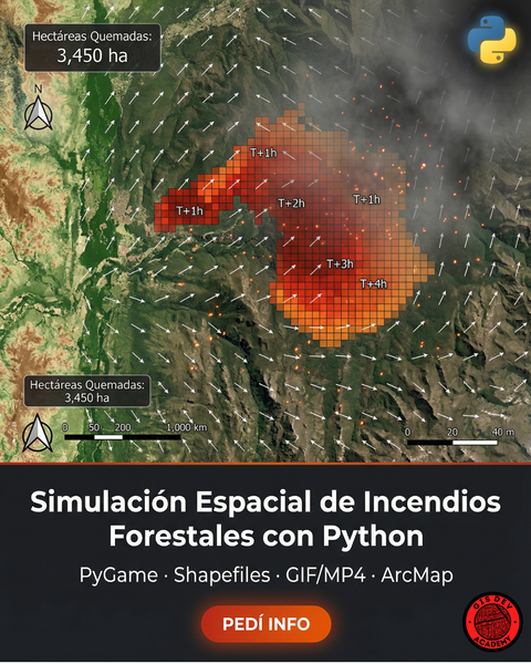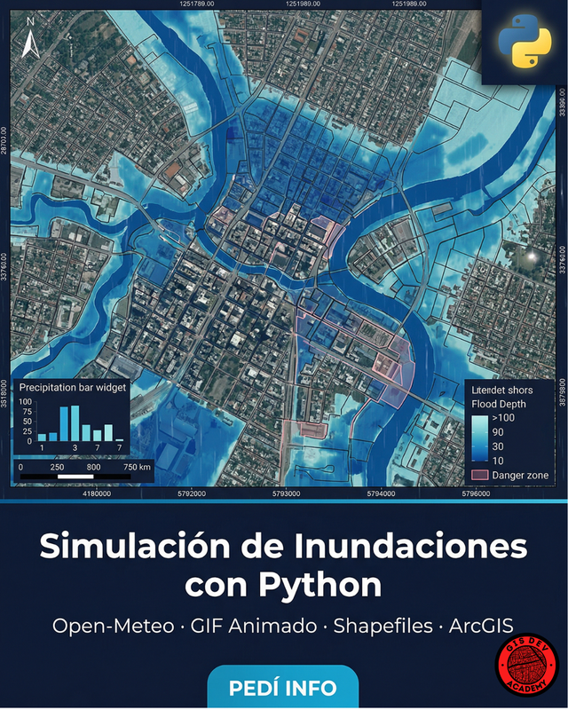 Curso práctico donde construís un simulador real de inundaciones con Python, desde la descarga de datos hasta resultados GIS profesionales: GIF animado, shapefiles, CSV y mapas finales, ejecutado por terminal y listo para QGIS/ArcGIS.