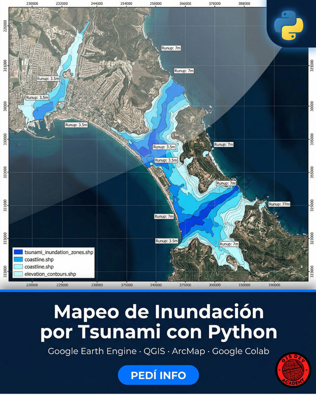 Aprendé a modelar y cartografiar una huella potencial de inundación por tsunami usando Python, Google Earth Engine y ArcMap/QGIS. Ejecutarás un flujo completo reproducible: descarga de DEM, semilla oceánica, conectividad hidráulica, generación de SHP y mapa final listo para impresión.