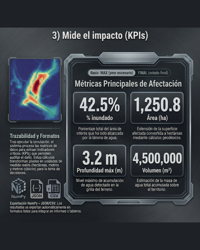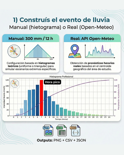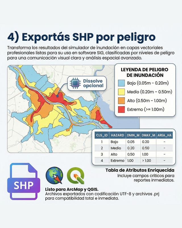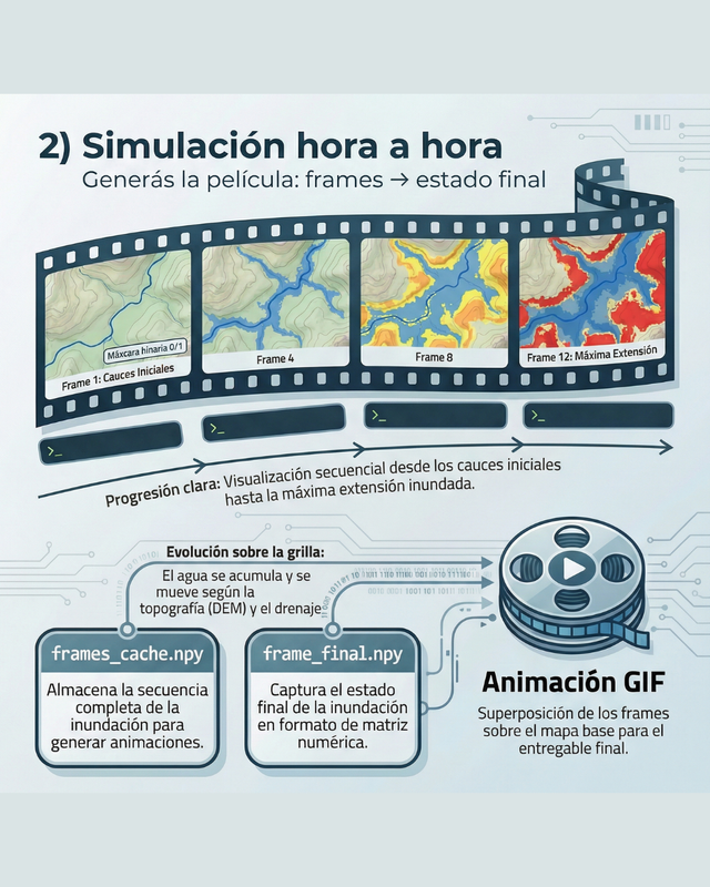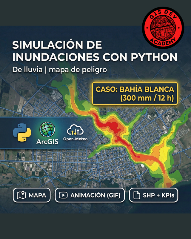 Curso práctico donde construís un simulador real de inundaciones con Python, desde la descarga de datos hasta resultados GIS profesionales: GIF animado, shapefiles, CSV y mapas finales, ejecutado por terminal y listo para QGIS/ArcGIS.